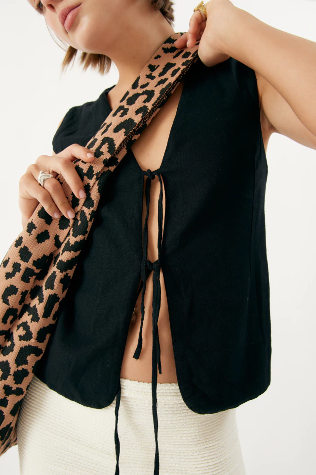 Chaleco de lino doble tela con tiritas para atar.