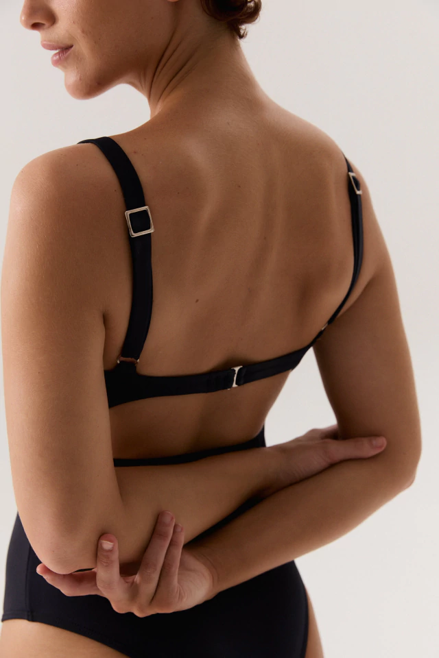 Entero negro de microfibra super premium con argolla de resina en el frente. Los breteles son anchos tienen elástico interno y regulador. Es super elegante y brinda un soporte perfecto!