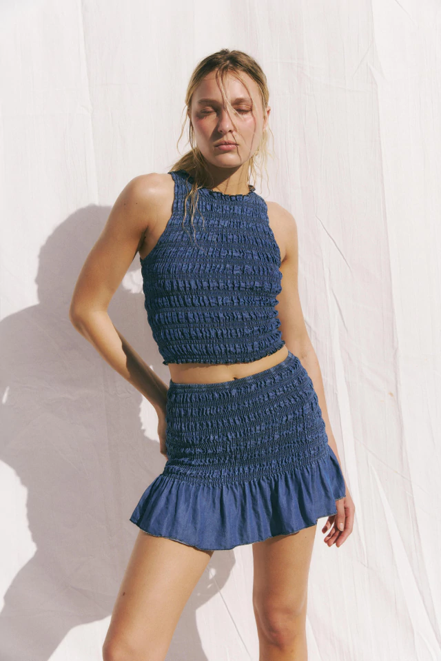 Top sin mangas confeccionado en tela de jean de tencel con bordado en punto smock, generando un fruncido desde el hombro hasta la cintura, terminando en un volado. Es super cabedor ya que se estira hasta 3 veces su tamaño, adaptandose a todos los cuerpos! El jean es finito y tiene un lavado que hace que destaque el efecto del smockeado y sea super suave al tacto.